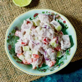 Se añade crema de coco para cubrir perfectamente los dados de lomo de atún y se le añade pimiento rojo, pepino y cebolla roja picada. Luego sazone con sal y sabor fresco. Las matas de Ika se pueden comer como plato principal o como un aperitivo refrescante. Rápido y fácil, es fácil de preparar con anticipación y no requiere muchos ingredientes.