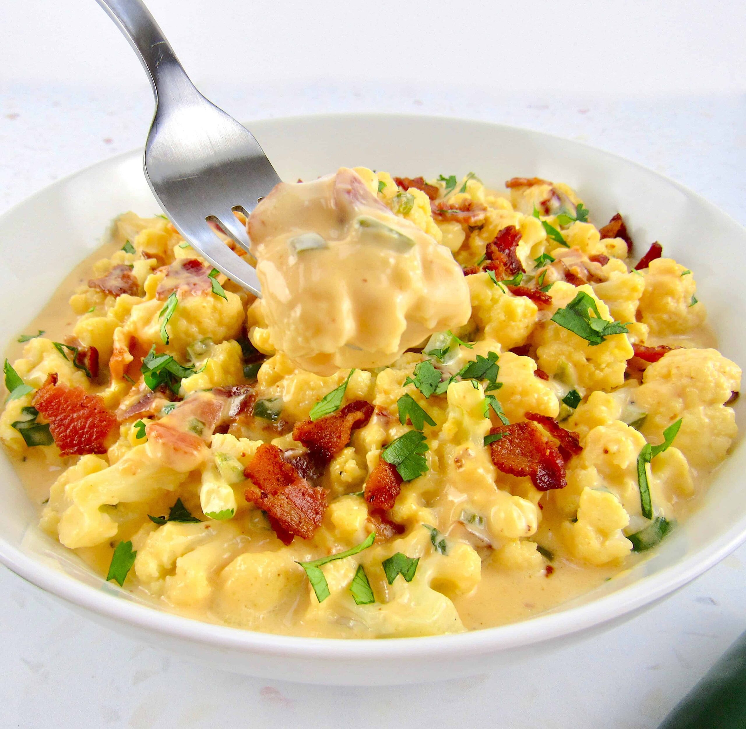Adorné mi plato cetogénico de coliflor con un poco de cilantro fresco picado, pero puedes usar perejil picado, cebollín o jalapeño. Si eres fanático del cilantro, también puedes mezclar una cucharada en la salsa.