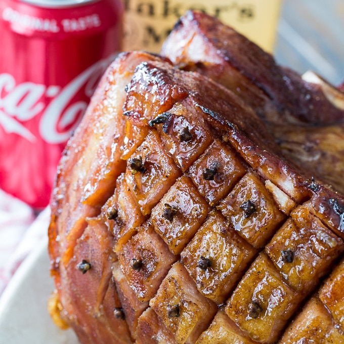 Un glaseado deliciosamente dulce de bourbon, azúcar moreno oscuro, mostaza de Dijon, pimienta de cayena y pimienta negra le da a este jamón de bourbon y Coca Cola un final maravilloso.