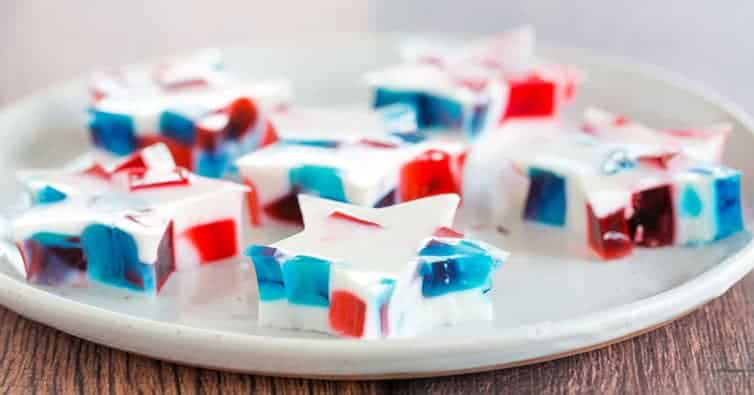 Porciones: 24 porciones Preparación: 30 minutos Tiempo de carga 6 horas Total: 6 horas 30 minutos ¡Estas gelatinas de cristal rojas, blancas y azules son una adición fácil y divertida a su celebración del 4 de julio!