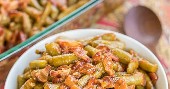 - Mezcle la salsa de tomate, el azúcar moreno, las hojuelas de cebolla y la salsa Worcestershire. Verter sobre las judías verdes.
