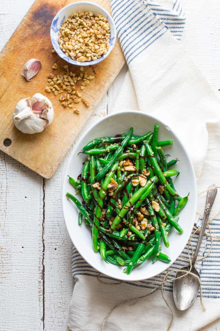 Esta receta balsámica de judías verdes con nueces es muy simple, pero los sabores son complejos en el mejor de los casos. La dulzura de la nuez de ajo combinada con la carnosidad de las nueces y la brillante acidez del balsámico envejecido llevan las judías verdes a un nivel completamente nuevo.
