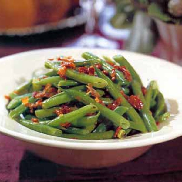 - Cocine los frijoles en una olla grande con agua hirviendo con sal hasta que estén tiernos y crujientes, aproximadamente 4 minutos. Fuga. Enjuague con agua fría. Seque bien. Seque con una toalla de papel. (Se puede preparar con 6 horas de anticipación. Envuélvalo en toallas de papel; envuélvalo en una bolsa de plástico con cierre y refrigere).