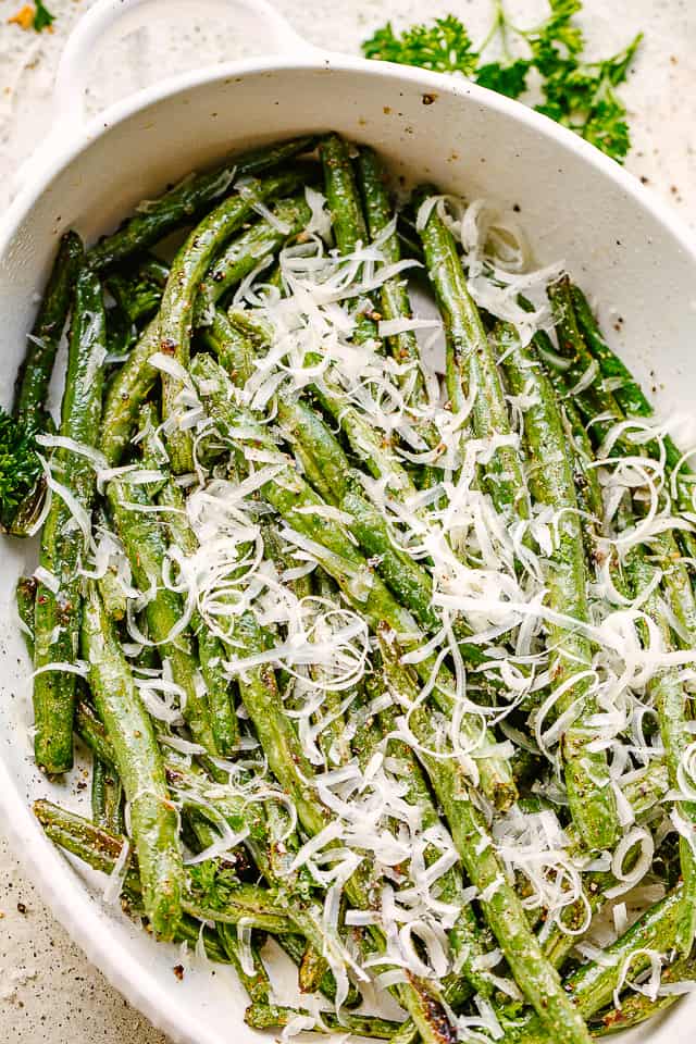 ES Judías verdes tostadas fáciles ingresos ¡Hace judías verdes asadas crujientes servidas con queso parmesano! Una idea simple y deliciosa para guarniciones bajas en carbohidratos y cetogénicas. Un complemento perfecto para su cena de Acción de Gracias o Navidad.