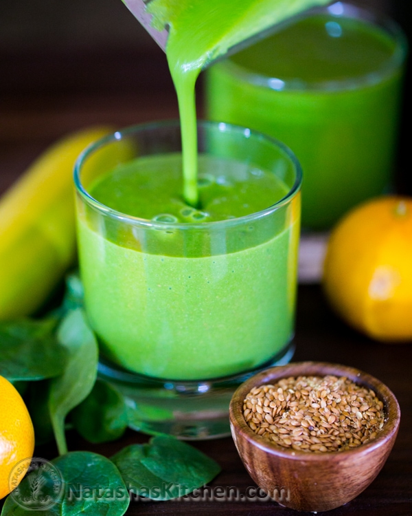 Agregue los ingredientes a la licuadora, cierre la tapa y seleccione “jugo entero”. Se hace en menos de un minuto, y las semillas de lino se mezclan muy bien en mi Blendtec (¡no son ásperas!).