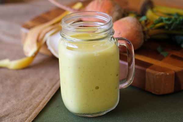 Si la luz del día adicional y el clima más cálido no te han animado, este batido sin duda lo hará. ¡Aumenta tu nivel de energía a través de las nubes! Está repleto de vitaminas y nutrientes… y por lo tanto, remolachas doradas. La remolacha dorada, la avena, los plátanos, la leche de almendras, la leche de coco y una pizca de canela son un sabroso manjar y una comida en un vaso.
