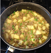 3. Agregue las papas, el yogur y la leche. Llevar a ebullición, reducir inmediatamente el fuego, tapar la cacerola y cocinar hasta que las papas estén tiernas. (Descubrí que hervir las papas tomó más tiempo de lo que esperaba. Tal vez las corté demasiado grandes. Otra forma de acelerarlas un poco sería hervirlas parcialmente en otra sartén mientras se dora la carne, así que agrégalas en este paso. . . )
