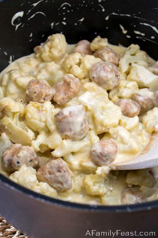 Para mantener las cosas bajas en carbohidratos, cambiamos la coliflor cocida por pasta y agregamos salchicha de pollo al plato, pero puede omitir eso o cambiar a otra salchicha de su elección. (Solo asegúrese de ajustar el cálculo nutricional si realiza algún cambio en la receta).