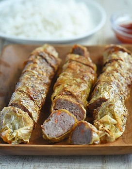 Una adaptación local de la ONG Ngo hiang, estos rollos de carne están hechos con cinco carnes picadas sazonadas y camarones picados. La mezcla de carne se envuelve en tawpe, se cuece al vapor hasta que esté bien cocida y se fríe hasta que esté dorada y crujiente.