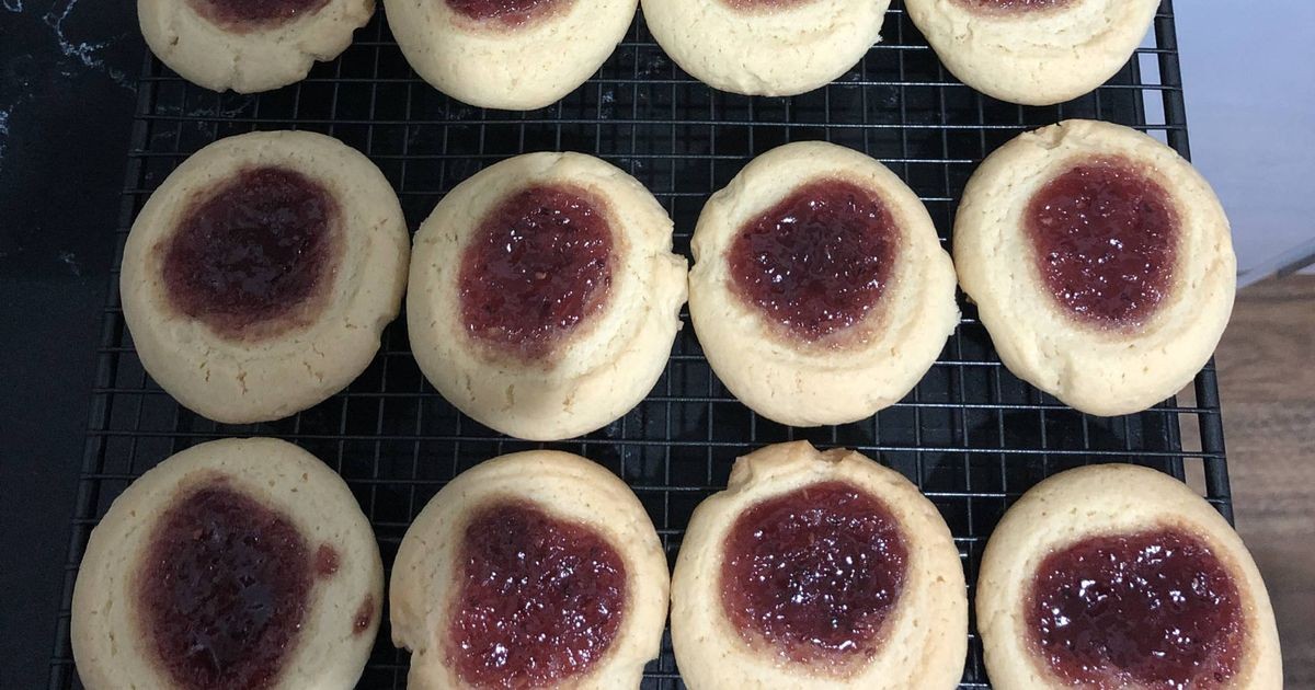 Rompa la masa en trozos pequeños, presione el agujero en el centro con un corcho y rellene con mermelada.