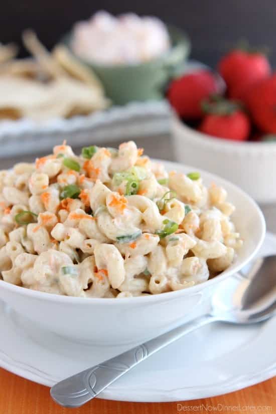 Esta ensalada de pasta es de estilo hawaiano. ¿Saben, caballeros tirando kalua y arroz pegajoso en su plato al lado de su carne de cerdo? Es SÚPER cremoso y no absorbe la salsa, pero para hacerlo así, debes usar el método y los ingredientes correctos, ¡sin sustituciones, lo siento! ¡Esta es una ensalada grasosa picada!