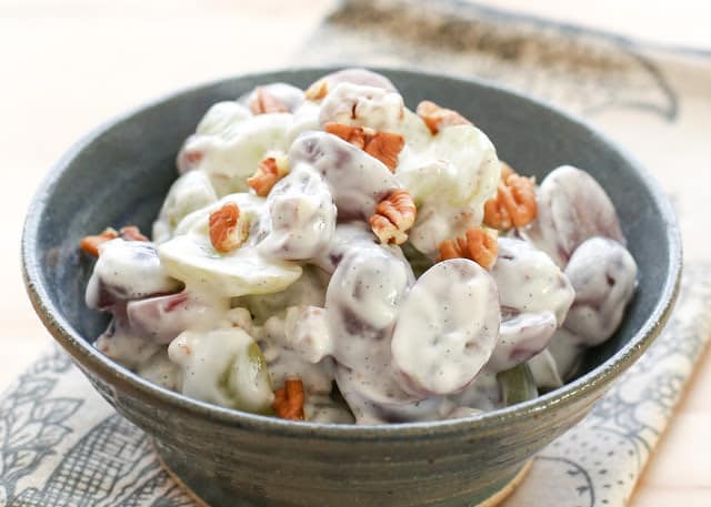 Uva dulce, nueces crujientes y crema agria de vainilla se combinan en esta ensalada de uva inesperadamente deliciosa con crema de vainilla dulce y frijoles. Mis hijos se volvieron locos con esta ensalada la primera vez que la preparé y no podía dejar de comer los bocados.