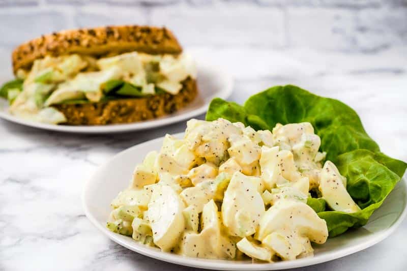 ¡Esta receta de los mejores sándwiches clásicos de ensalada de huevo es fácil, simple y deliciosa! Los huevos duros se combinan con apio, mayonesa, semillas de apio, mostaza de Dijon, jugo de limón, sal y pimienta, todo apilado sobre su pan, bocadillo o croissant favorito. ¡También genial con tostadas!