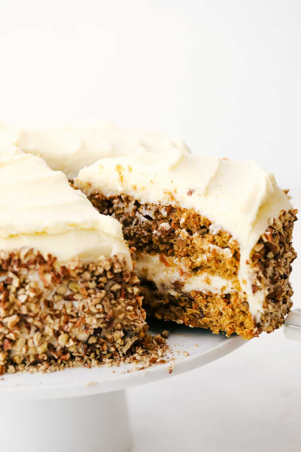 Hay varios ingredientes que hacen que este pastel sea único y se destaque del resto. La compota de manzana es uno de mis ingredientes favoritos para pasteles. Ayuda a mantener la masa del pastel húmeda y sabrosa al mismo tiempo. Se le añaden especias clásicas y también le dan ese toque de sabor. En general, esta receta de pastel de zanahoria es uno de los MEJORES pasteles que jamás comerá. Con el rico glaseado de queso crema encima, establezca un tono para este pastel. Aprovecha esto para fiestas especiales, Semana Santa o simplemente un postre primaveral. ¡Es un favorito casero!