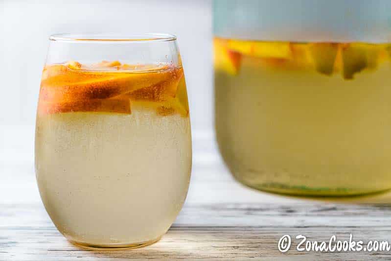 La sangría de melocotón blanco es refrescante con melocotones remojados en moscatel y ron y es perfecta para una cena romántica para dos, cenas o simplemente para disfrutar de una cálida tarde de primavera o verano.