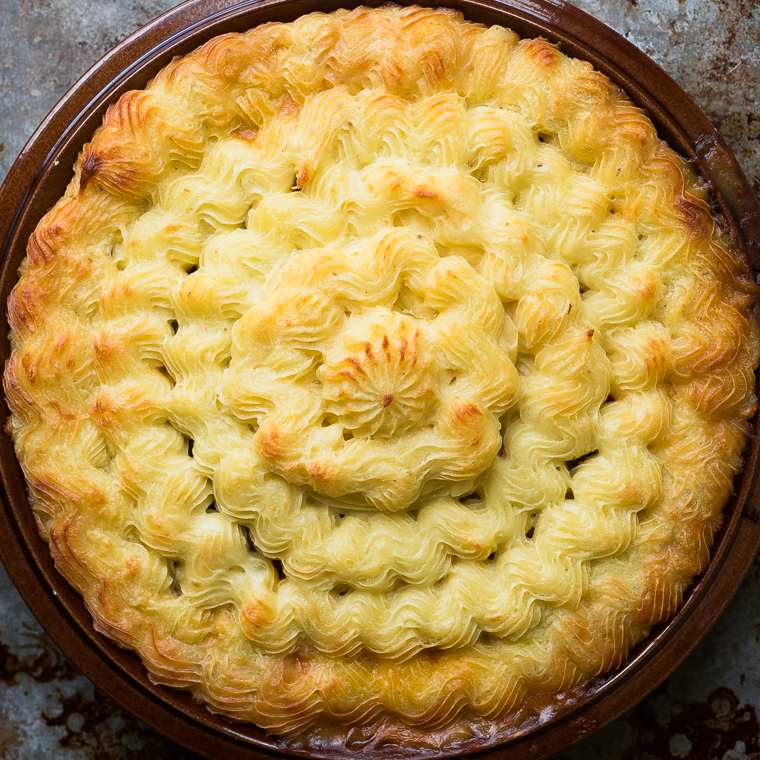 El puré de papas en la parte superior está hecho con suero de leche y buen queso cheddar inglés (aunque usé el buen Tillamook americano).