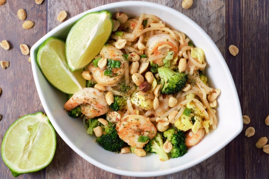 Este camarón tailandés tiene suculentos fideos de arroz, brócoli y camarones en una cremosa salsa de mantequilla de maní tailandesa.