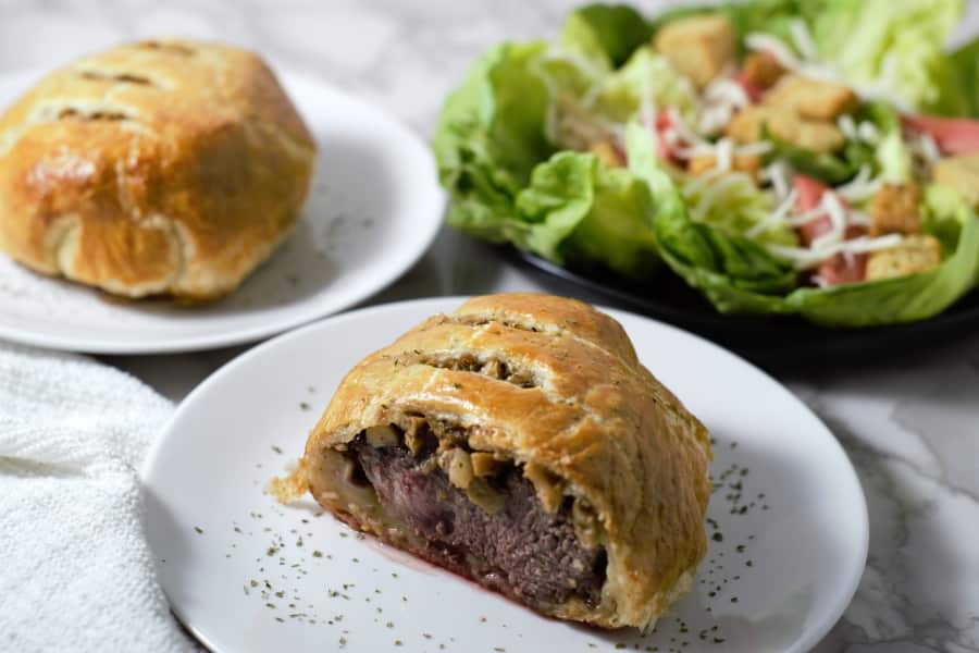 Este exclusivo plato Wellington de ternera tiene un sabroso relleno de champiñones cubierto con carne increíblemente tierna y envuelto en una masa de hojaldre dorada que es crujiente pero que también se derrite en la boca al mismo tiempo.