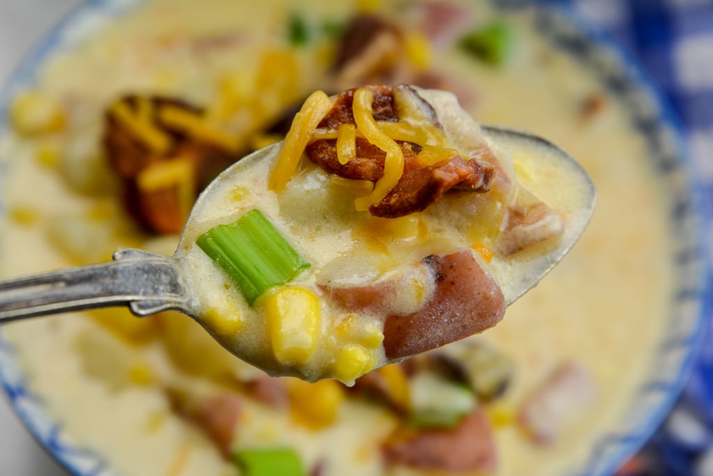 Para mi sopa de maíz cargada, realmente fui por el departamento de sabor. Quería capas de sabor, así que busqué cebollas, apio, zanahorias, maíz, bistec de jamón, caldo de pollo, tocino y un puñado de aderezos. Todo funciona tan bien que hace la mejor sopa de maíz.