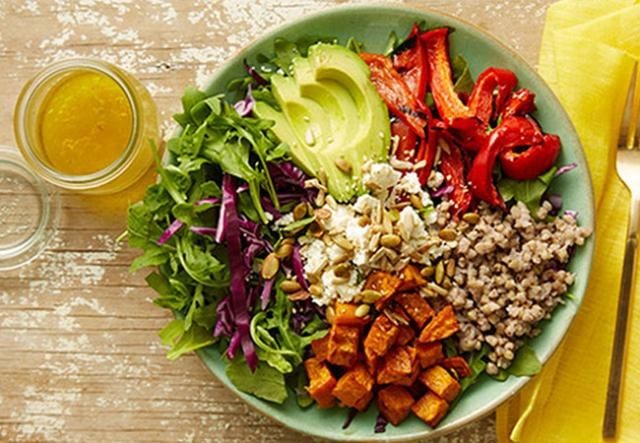 En un tazón, combine la rúcula, el repollo y la menta. Agregue el trigo sarraceno, las verduras asadas y el aguacate.