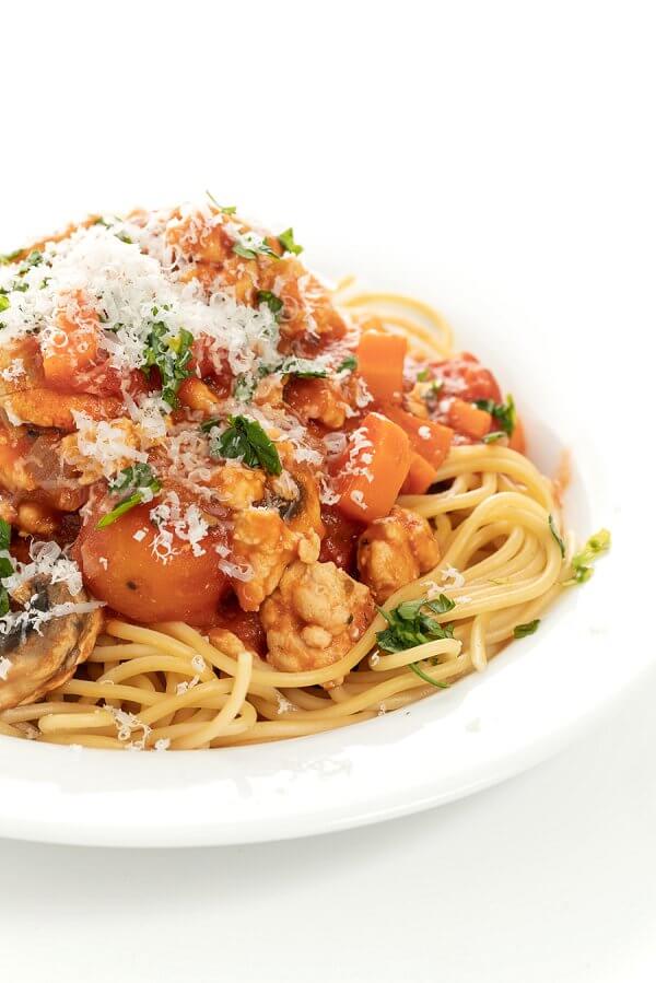 Una de mis recetas de pasta es una versión más saludable de la boloñesa. Hecho con pavo molido, vino blanco, ajo y champiñones, es delicioso servido en cualquier pasta, incluidos espaguetis, penne, linguini o conchiglie.