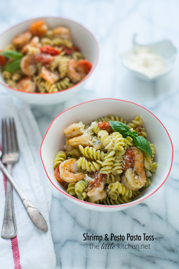 - Agregue la pasta cocida, los camarones y el tomate a un tazón grande. Mezcla. Agregue el pesto y mezcle hasta que se incorpore. Cubrir con queso parmesano rallado y servir inmediatamente.