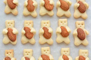 Tenga cuidado de no hacer demasiados osos a la vez o la masa podría secarse. Si está seco, simplemente sumerja el dedo en un recipiente pequeño con agua y extienda una pequeña cantidad de agua sobre el molde antes de levantar los brazos y colocar sobre la almendra.