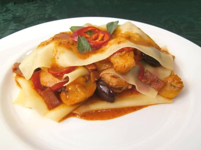 Para servir, coloque una hoja de lasaña en el plato y agregue un poco de pasta de pollo, coloque otra hoja de lasaña encima de la pasta y luego un poco más de pasta. Terminar con una lámina de lasaña, un poco de salsa y decorar con albahaca fresca y pimienta.