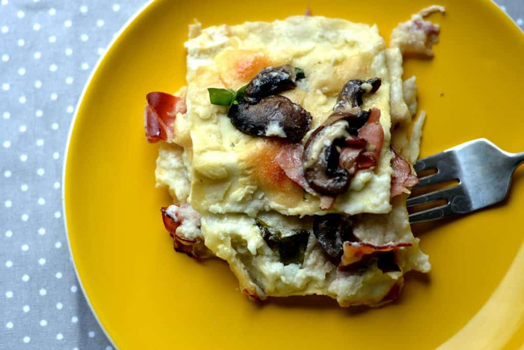Lasaña de jamón y champiñones con salsa de coliflor