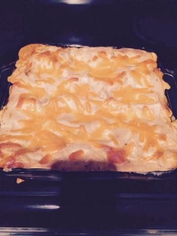 Hornee por 30 minutos o hasta que la lasaña comience a dorarse alrededor de los bordes.