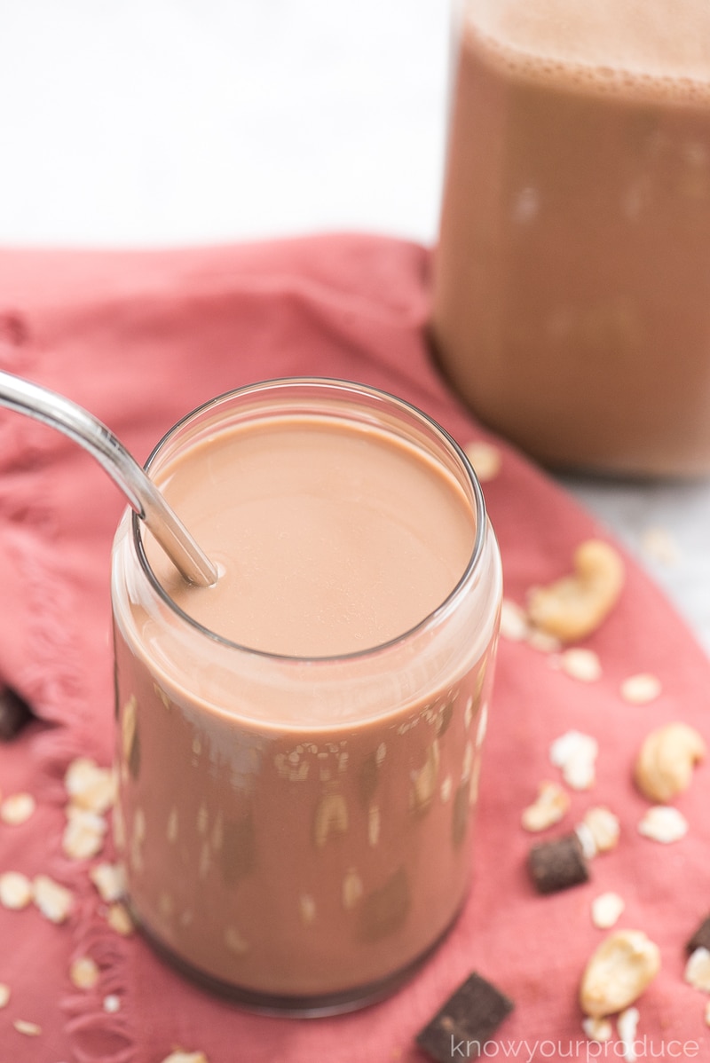 ¡La leche de avena con chocolate vegana casera con anacardos es tan fácil de hacer en casa y mejor que la comprada en la tienda! Es cremoso, chocolatoso y completamente libre de lácteos. Sin aceites ni conservantes añadidos.