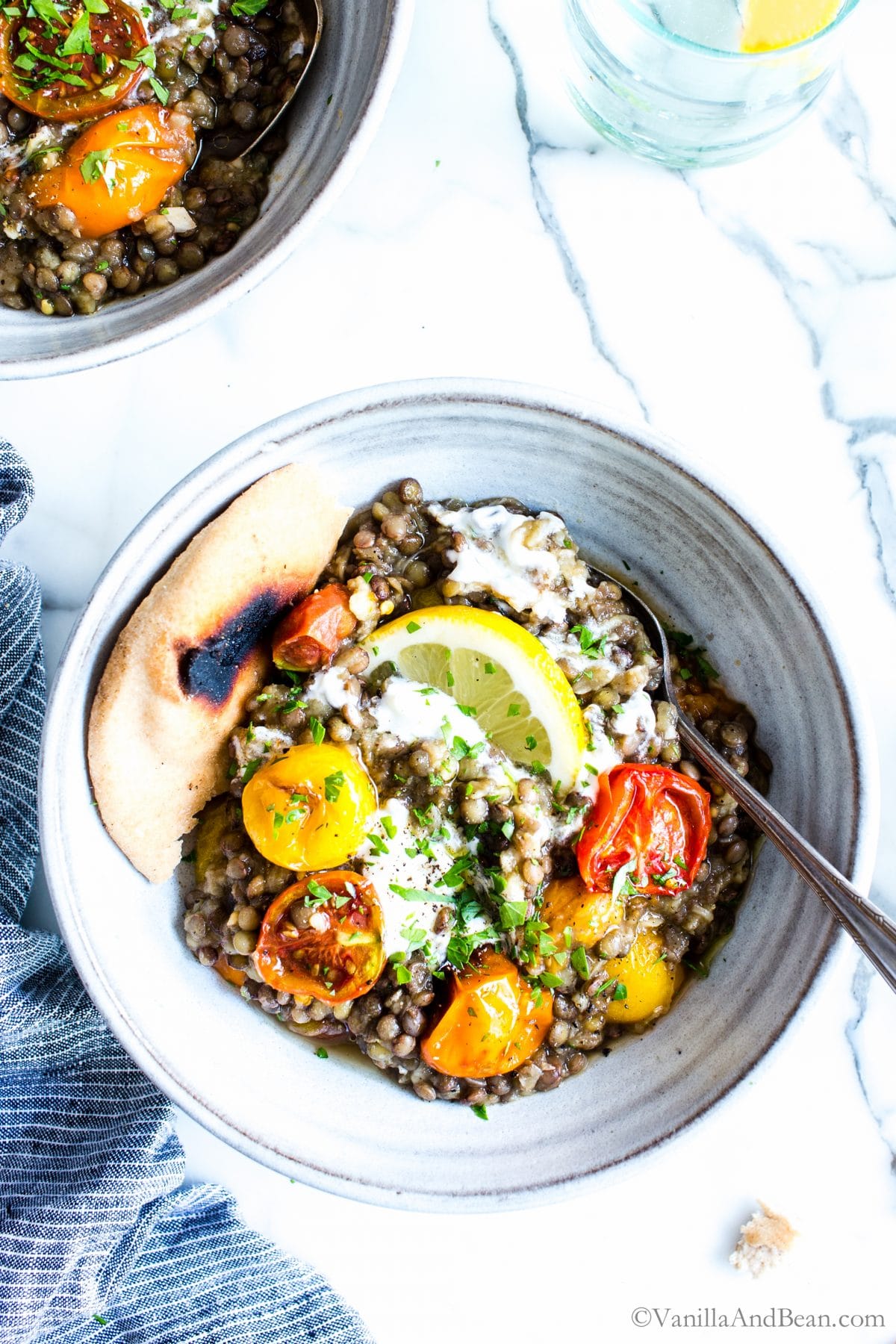 Las abundantes lentejas al limón y al ajillo con berenjena asada y tomate son nutritivas y muy fáciles de hacer. ¡Comparte esta receta mediterránea de berenjenas con naan o un trozo de masa crujiente y una cucharada de yogur griego o crema de coco! Esta receta es vegetariana + vegana + sin gluten.
