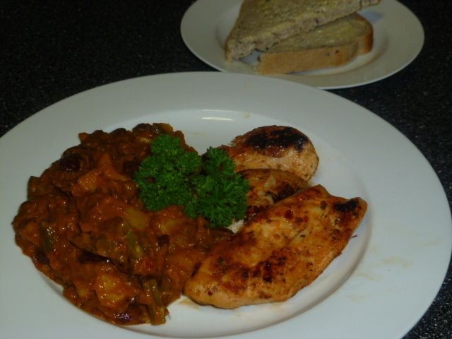 Yo uso la salsa jalfrezi picante de Patak. Si no estuvieras cocinando para un vegetariano, podrías usar caldo de pollo en lugar de vegetales. Use frijoles verdes de hojalata en rodajas.