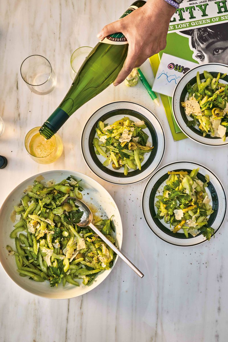 Todos los sabores de una ensalada César están aquí: ajo, anchoas, parmesano y aceite de oliva, en proporciones bastante extrovertidas. La diferencia entre este y un César más didáctico no es solo que reemplacé el romano con apio fantásticamente crujiente, sino también que esta salsa es más una vinagreta que fluye libremente y cubre cada rebanada. En lugar de picatostes, hay aceitunas tiernas saladas y pimientos en vinagre.