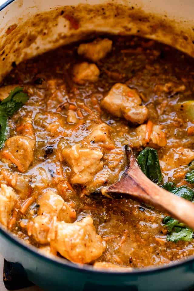 - Dore la carne de cerdo y las verduras y colóquelas en la olla de cocción lenta. Caliente el aceite en una sartén grande. Luego agregue la carne de cerdo, las zanahorias, las cebollas y el ajo; saltee hasta que el cerdo esté dorado por todos lados. Retire la sartén del fuego y transfiera la mezcla de cerdo a una olla de cocción lenta de 6 cuartos o más grande.