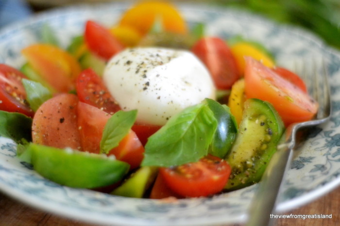 Para esta ensalada, rompí las hojas de albahaca más pequeñas y las rellené aquí y allá. De esta manera, la albahaca no duele y se mantiene fresca y verde. Haz esta ensalada de última hora antes de comer porque quieres que todo esté más fresco. Los jugos de tomate se mezclarán con aceite y vinagre para formar el mejor condimento de la naturaleza. Solo necesita agregar sal y pimienta antes de separar el queso burrata. ¡Me estoy volviendo loco solo de pensarlo!