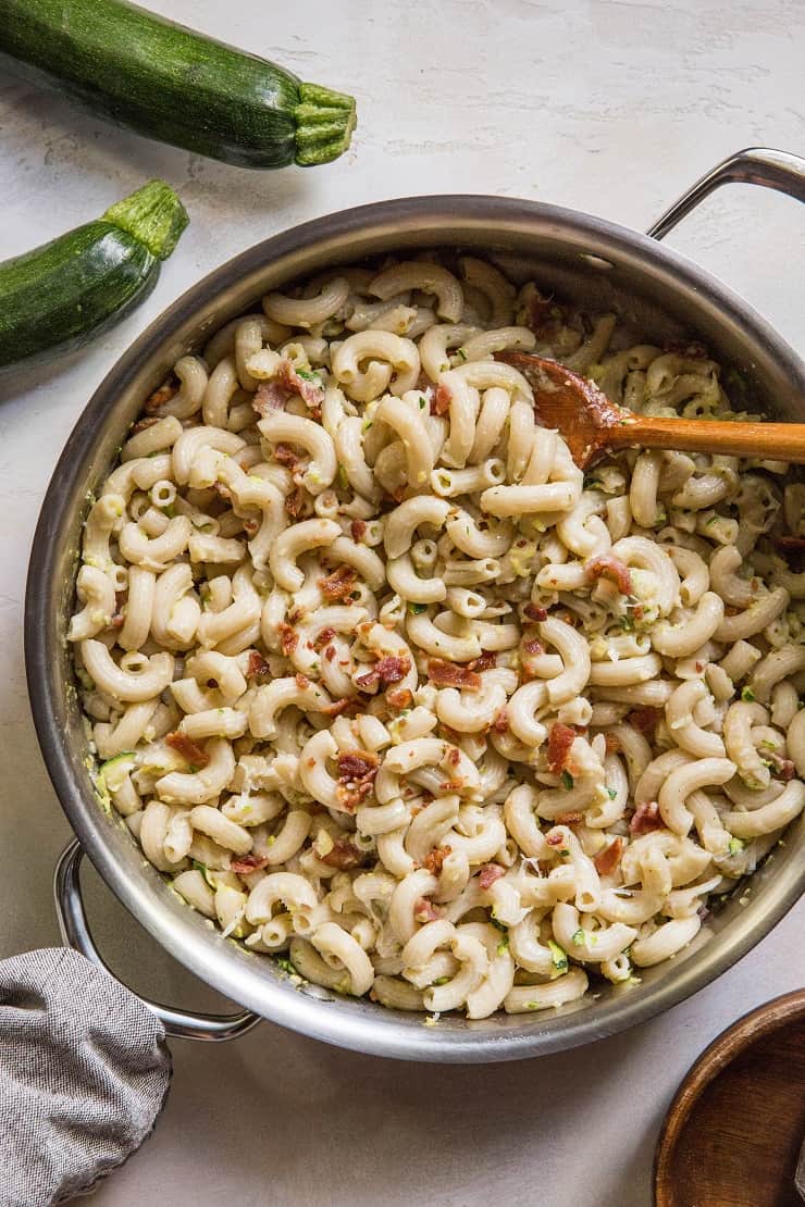 Macarrones con queso sin gluten con calabacín y tocino