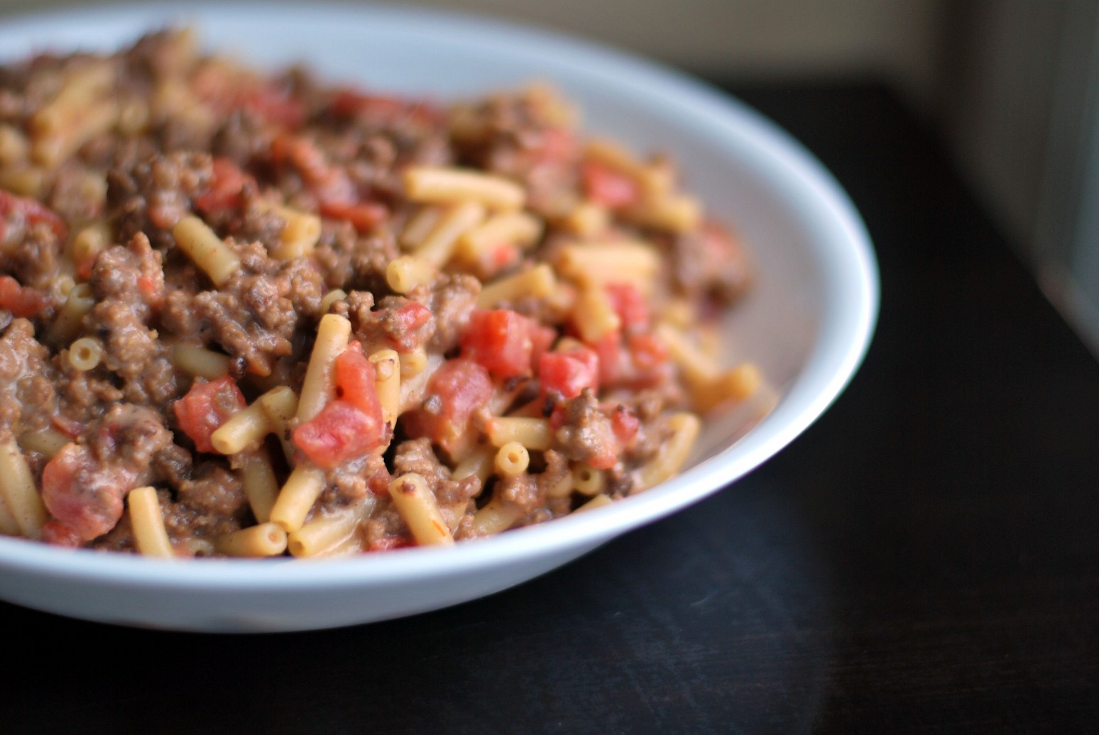 Prepare los macarrones con queso según las instrucciones del paquete. Agregue la carne molida cocida y los tomates picados, incluido el jugo. Si lo desea, cubra con queso parmesano recién rallado. Atender.