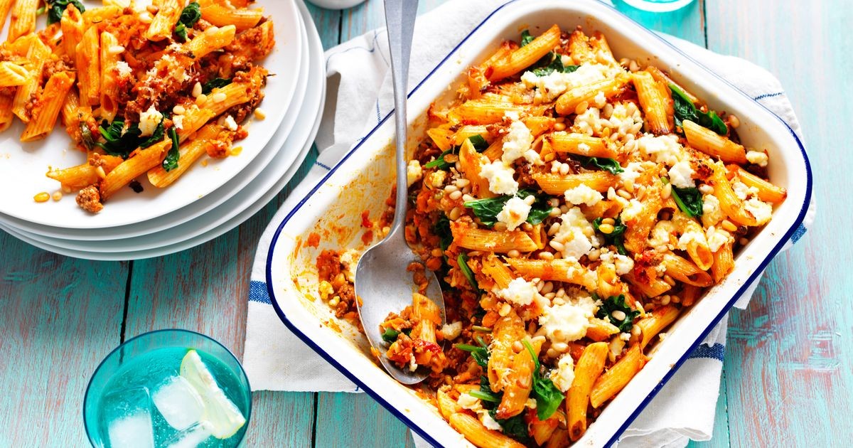 Combine la mezcla de pasta y carne en una fuente para hornear de 8 tazas. Espolvorear con ricotta, parmesano y piñones. Cocine durante 15-20 minutos hasta que estén doradas.