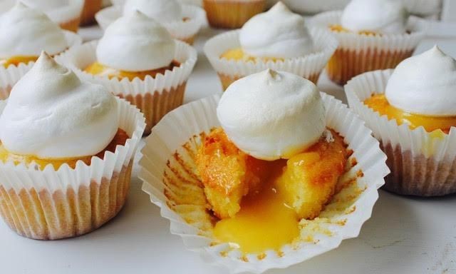 Cuando esté frío, toma un pequeño trozo de pastel de la parte superior con un cuchillo y agrega una cucharada de crema de limón. Regrese a la bandeja de muffins.