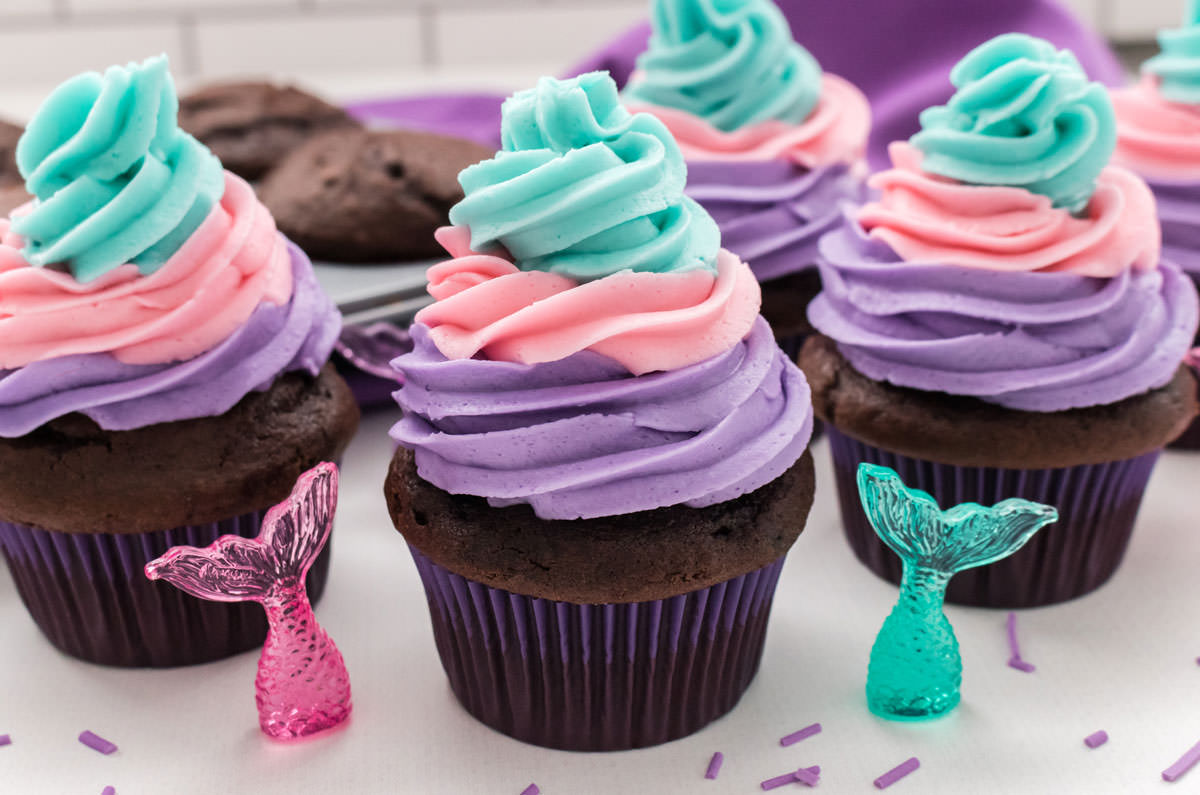 Cada fiesta de cumpleaños bajo el mar necesita lindos cupcakes de sirena y niño, lo tenemos todo para ti. Presentamos deliciosos cupcakes de chocolate cubiertos con cremosos remolinos de glaseado de crema de mantequilla casero en los colores de sirena más perfectos. Son tan fáciles de hacer y tan deliciosos de comer… tu Sirenita chillará de alegría.