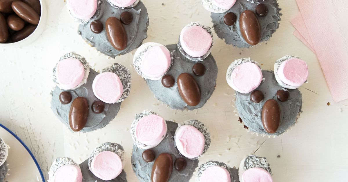 Para hacer la crema de mantequilla, con batidoras eléctricas, bate la mantequilla en un bol hasta que esté muy pálida. Agregue gradualmente el azúcar en polvo, en tandas, batiendo bien entre tandas. Agrega la leche y bate para combinar. Mancha con colorante alimentario negro para que el glaseado sea de color gris claro. Extienda el glaseado sobre los pasteles, reservando ¼ de taza de glaseado para las orejas.