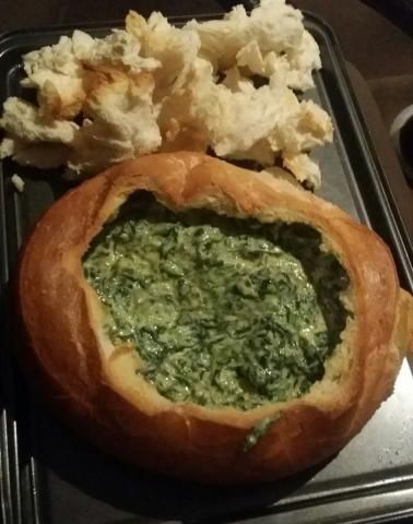 Mientras se hornea el pan, descongele las espinacas y escúrralas, exprimiendo la mayor cantidad de agua posible y colocándolas en un plato apto para microondas. Freír la panceta en una sartén con un chorrito de aceite. Agregue la crema agria, el queso, la mezcla de sopa de verduras de primavera, la mayonesa y el tocino. Mezcle hasta que esté combinado. Microondas durante 3-4 minutos hasta que esté caliente.