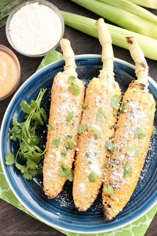 ¡Volví! ¡Es un poco loco por aquí que tengo 3 hijos! Nuestro nuevo paquete de alegría nos mantiene bastante ocupados y con sueño, por decir lo menos, pero estoy volviendo al blog. La receta de hoy es de una de mis recetas favoritas de verano: el maíz en mazorca mexicano, también conocido como Elote(s). Una vez que tienes maíz en la mazorca así, ¡es difícil volver a la mantequilla y la sal viejas!