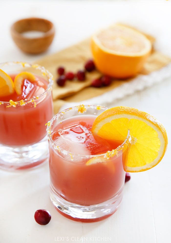 Jugo de naranja recién exprimido, tequila, una pizca de jugo de arándano y una pizca de dulzura y ralladura de naranja hacen de esta margarita el cóctel perfecto para las fiestas.