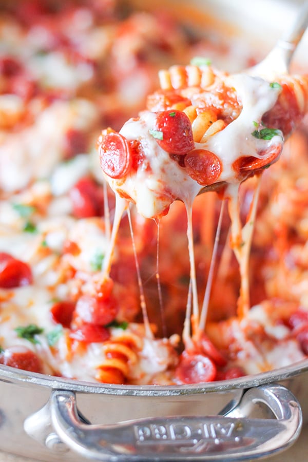 ¡Aquí hay una nueva receta para una olla que seguramente será un éxito para toda su familia! Esta masa de pizza One-Pot tiene todos los sabores de una pizza tradicional cocinada en salsa de tomate casera. Siempre estoy buscando nuevas variaciones de mis famosas comidas en un solo recipiente con mi familia y esta variación ha sido un gran éxito. Inicialmente, solo lo hice con mini pimientos y ¡estaba delicioso! Pero la próxima vez le puse medio kilo de salchicha italiana de pavo y ¡nos gustó aún más! La salchicha y el pepperoni son una combinación clásica de pizza, por lo que obviamente funciona perfectamente en esta masa. Lo que realmente me encanta de esta masa de pizza de una sola olla es que puedes agregar uno de tus ingredientes favoritos para personalizar la receta. Me gustaría cubrir el mío con champiñones y aceitunas, pero soy el único en mi familia al que le gusta esa combinación :o)