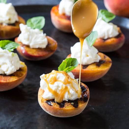 Un sencillo postre de verano de duraznos a la parrilla cubierto con crema fresca de mascarpone y salsa de caramelo.