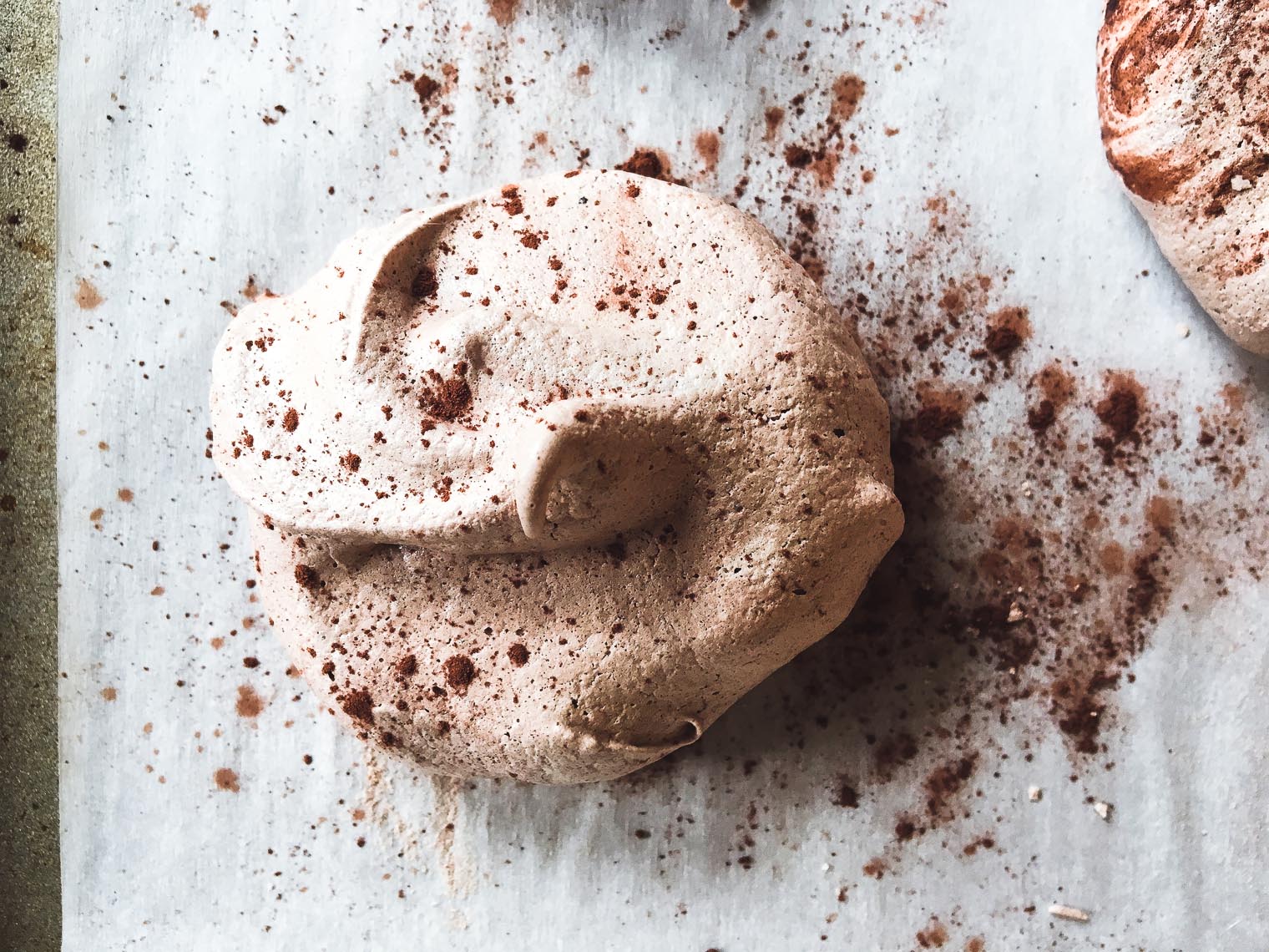 Son fáciles de hacer si tiene un procesador de alimentos o una batidora eléctrica y se adaptan fácilmente a millones y combinaciones de sabores. Lo mantuve simple con un poco de cacao en polvo y vainilla. La técnica es bastante simple y creo que los merengues son más indulgentes de lo que merecen crédito. Ya sean un poco crujientes o un poco masticables, siguen siendo geniales. Mi preferencia personal es cuando son esponjosos, crujientes por fuera y masticables por dentro.
