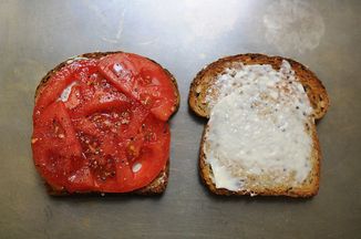 Nada del otro mundo, pero con los años fui retocando hasta que di con el bocadillo de tomate que mejor se adaptaba a mis gustos: dos tostadas integrales untadas con mayonesa y rellenas lo más generosamente posible con rodajas de tomate maduro, más un poco de sal y una espesa chile negro. — Merrill Stubbs