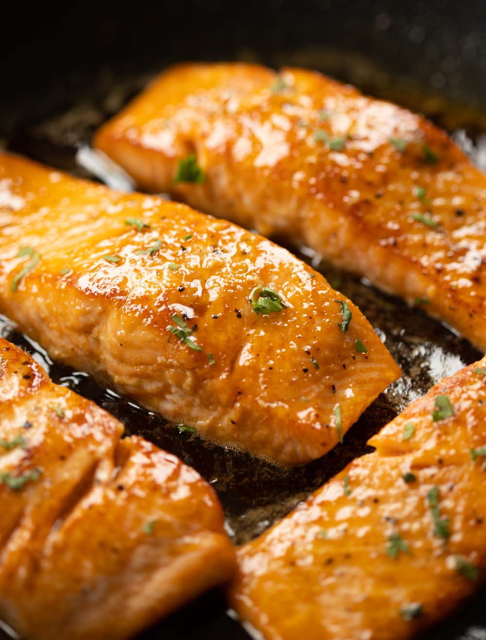 a) Preferencia de salsa – 1 cucharada de sriracha le dará una patada suave. Si quiere más, simplemente agregue 1/2 cucharadita a la vez después de mezclar todo. No quieres que domine, así que tómalo con calma. Si la salsa es demasiado dulce, agregue un poco más de jugo de limón y/o salsa de soya. La salsa de soya agregará una salinidad suave y profundizará el sabor, el jugo de limón agregará acidez. b) jugo de limon – El jugo de limón funciona mejor porque combina muy bien con salmón, soya, sriracha y miel. También les da la oportunidad de servir juntos al final. Sin embargo, la función principal es agregar acidez y cortar el dulzor de la salsa. Por lo tanto, el vinagre de arroz, el vinagre de vino blanco o el vinagre de sidra de manzana funcionan bien como sustitutos. c) Salmón perfectamente cocido – Desea que el salmón permanezca rosado oscuro y tierno en el centro cuando agregue la salsa, ya que continuará cocinándose. Como se mencionó, si se encuentra con salmón cocido antes de agregar la salsa, simplemente retírelo y reduzca la salsa sin él. Además, si quieres que el salmón se vea más raro, tíralo después de rociarlo. Los tiempos dependerán del grosor del salmón. Es un proceso bastante rápido, así que estad atentos. e) ajo en polvo – El ajo va muy bien con todos los ingredientes de este plato. Yo uso ajo en polvo para poder sazonar el salmón sin tener que usarlo fresco. Sin embargo, si solo dispone de ajo fresco, sazone el salmón con sal/pimienta y saltee 1 diente de ajo picado en mantequilla. e) calorías – Solo el salmón y la salsa, divididos por 4.